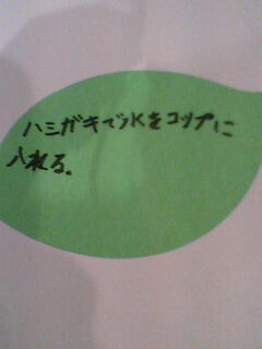 NISSANのパビリオンで、紙に省エネのために今日からできる事を書きました。 ぼくはハミガキの時に水をコップに入れる。 と、書きました。