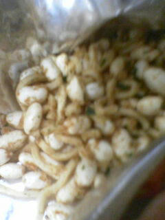 ポン菓子とベビースターラーメンがまざったようなものです。